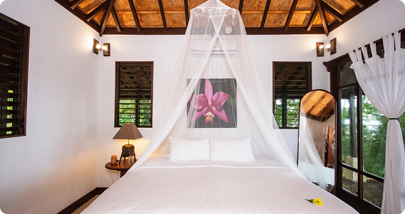 Cozy rooms with AC, private en-suite baths, partial ocean views, and easy access to the shared infinity pool. BONUS: These rooms include 1 massage.