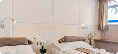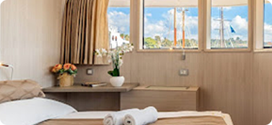 Each luxury cabin has a private bathroom, air-conditioning, and a wardrobe. Choose between two twin beds or a full size bed with deluxe linens.